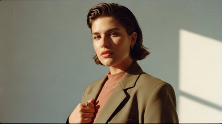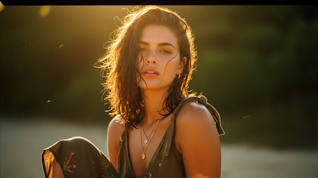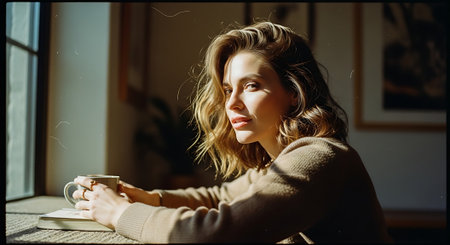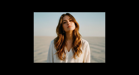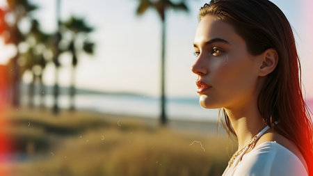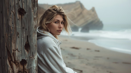 A contemplative woman stands by the ocean, her hair flowing in the breeze. The soft lighting and serene surroundings create a tranquil atmosphere, inviting reflection and peace.