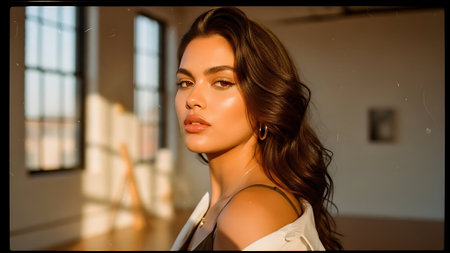 A model sits and looks at the camera during a photoshoot. Soft lighting creates a warm atmosphere in the studio. The setting is simple and focuses on the subject.