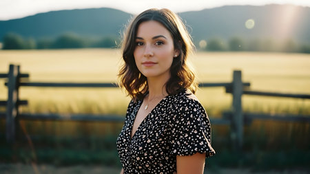 A young woman stands confidently in a golden wheat field, wearing a white sweater and blue jeans. She has long, wavy hair and is smiling softly at the camera. The sky is clear and blue, creating a serene and peaceful atmosphere.