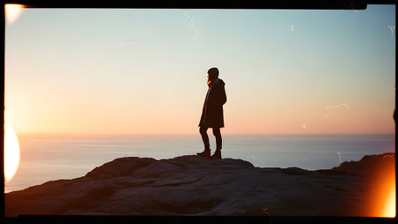 Silhouette of a woman standing on the edge of a cliff at sunset