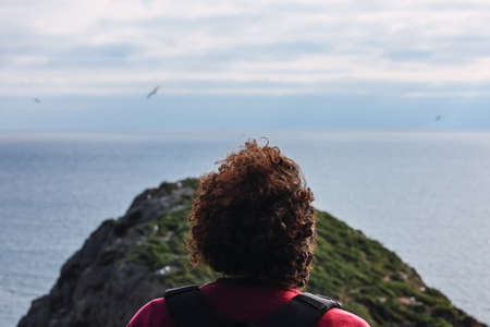 Back view of a woman taking a break while hiking to admire the dramatic cliffs and Irish gloomy landscape nearby the Giant's Causeway. Girl meditating or contemplating by the ocean in Northern Ireland