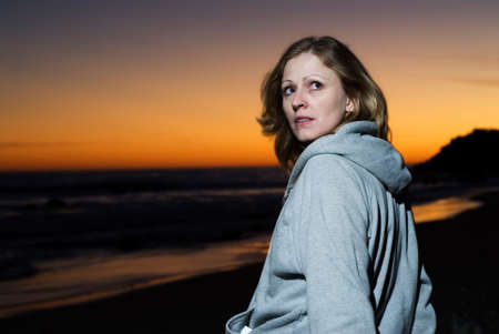 A woman stands by the sea at twilight with her hair blowing in the wind. She looks thoughtful and relaxed, enjoying the moment by the water. The sky has soft colors of evening light.