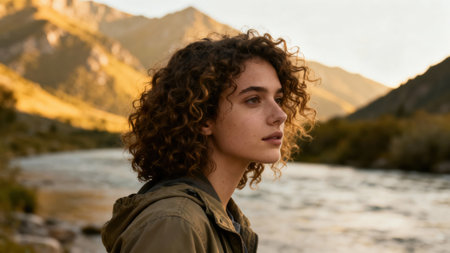 Profile of a youthful person with natural brown curly hair and an olive green jacket, standing near rushing water with rugged, sun-drenched mountain peaks in the background.