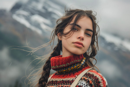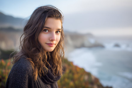 A young woman with long, wavy brown hair and brown eyes looks directly at the camera with a slight smile. She is wearing a dark, textured sweater and a scarf. The background is a blurred coastal landscape with the ocean and cliffs visible, suggesting a serene and natural setting.