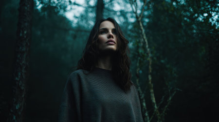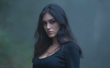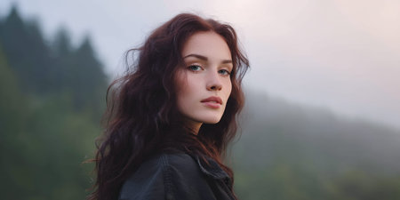A young woman with long, dark, wavy hair and blue eyes looks into the distance with a thoughtful expression. She is wearing a dark jacket and is outdoors with a misty forest in the background.