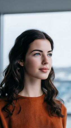 A young woman with dark, wavy hair and striking blue eyes gazes thoughtfully into the distance, her expression serene. She is wearing a warm, rust-colored sweater, and the soft, natural light suggests a moment of quiet contemplation by a window.