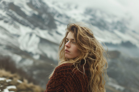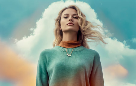 blonde woman wearing a sweater, standing against a cloudy sky, exuding an ethereal, dreamy vibe