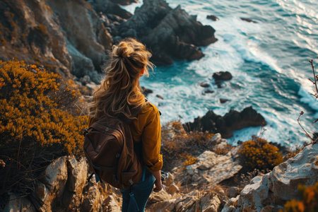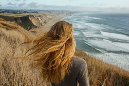 Adventurer with flowing hair stands in wild coastal terrain, surrounded by resilient grass and golden cliffs under warm light.