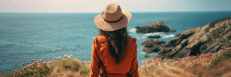 Back view of beautiful young woman admiring scenery while visiting English countryside on sunny summer day. Banner with young female travelling alone. Generative AI.