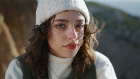Portrait girl blowing hair at rocky mountain. Beautiful tourist looking camera resting in sunlight. Thoughtful woman taking break posing on weekend holiday outdoors. Calm satisfied female enjoy travel