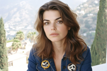 A young woman with curly dark hair and large gold earrings poses for a portrait with a blurred ocean and coastline in the background.