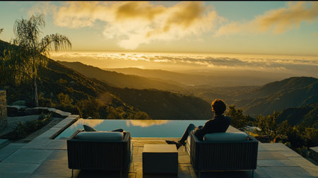 A tranquil scene of an individual enjoying a stunning sunset from a luxurious outdoor setting with an infinity pool, capturing the essence of relaxation in nature.