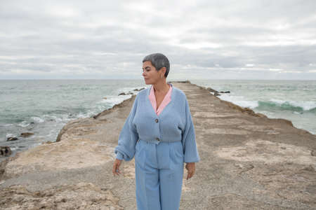 Tranquil woman walking near sea. Female model with short hair having walk on cloudy day. Nature, spare time concept