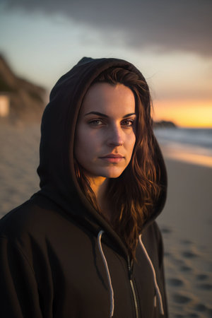 A young woman with long brown hair stands in front of a serene ocean backdrop during sunset, wearing a black jacket and white shirt, with a calm and contemplative expression.