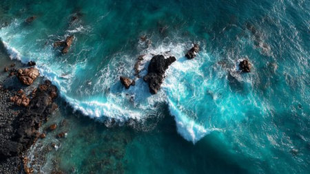 AI Generated. Aerial view of the ocean meeting the rocky coastline