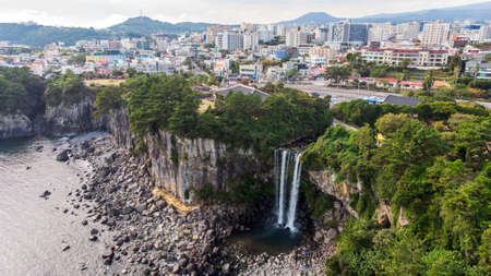. Aerial View of The High Waterfall Jeongbang, Lagoon and Seoqwipo on Jeju Island, South Korea.