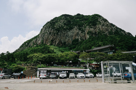 Jeju Island, South Korea - July 12, 2022: Sanbang Mountain in summer at Seogwipo city, Jeju island, South Korea.