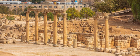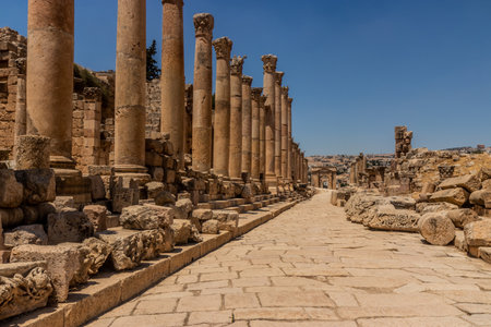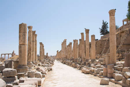 A view looking down the Cardo showing stone carved columns and paved street at the ancient city of Jarash or Gerasa, Jerash in Jordan. ancient Roman sights. Panorama