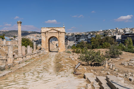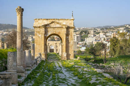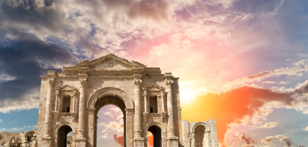 Arch of Hadrian in the ancient Jordanian city of Gerasa, preset-day Jerash, Jordan. It is located about 48 km north of Amman. ancient Roman city of Jerash is one of the main attractions of Jordan