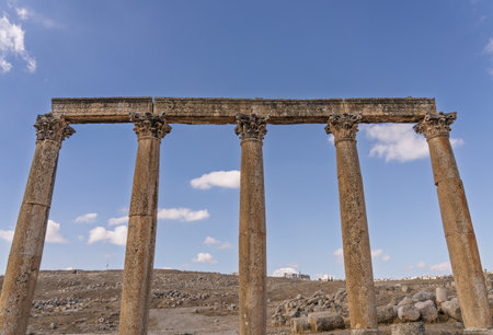 Roman architecture. old historic district of Jarash. High beautiful antique columns against the blue sky. Temple of Artemis in the ancient Roman city of Gerasa in Jarash, Jordan.