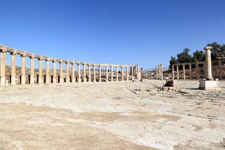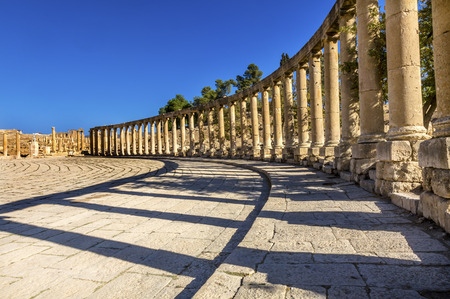 JERASH, JORDAN - MAY 2, 2014: Colonnade on the Roman Oval Forum, Ancient Roman city of Gerasa of Antiquity , modern Jerash. Gerasa was found in 2000 BC