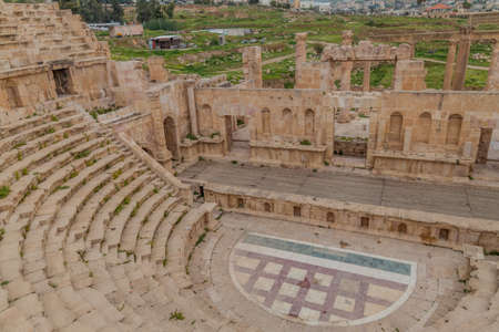 Jerash, Jordan - Panoramic view of Roman theater in Jerash, Ancient Roman city in Jordan.