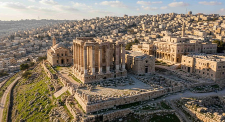 Jerash Gerasa, Jordan, ancient roman columns and ruins high angle view banner