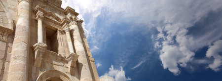 Arch of Hadrian in Gerasa (Jerash)-- was built to honor the visit of emperor Hadrian to Jerash in 129/130 AD, Jordan. Against the background of a beautiful sky with clouds