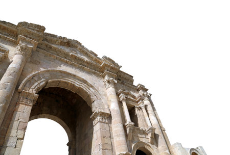 Arch of Hadrian in Gerasa (Jerash)-- was built to honor the visit of emperor Hadrian to Jerash in 129/130 AD, Jordan. Carved on white background