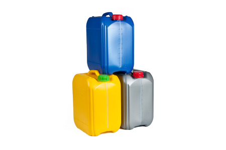 Plastic canisters for machine oil isolated on white background.