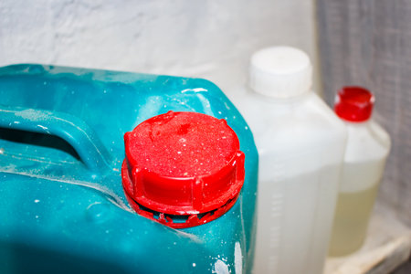 Blue fuel canister or gasoline outdoors on truck parking, energy crisis concept.