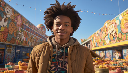 A young man smiles joyfully in a lively urban environment, surrounded by colorful graffiti artwork and warm bokeh lights, showcasing youthful energy and creativity.