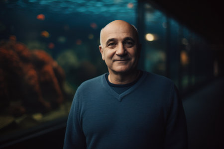 Portrait of a bald man in a blue sweater against the background of an aquarium.