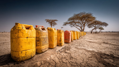 Colorful jerrycans are arranged on dry, cracked ground beneath a clear sky, with distant trees visible, highlighting the issue of water scarcity and environmental impact