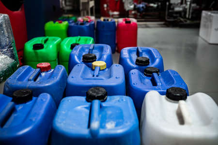 plastic cans of light green color in the warehouse, production, factory. Background from plastic canisters