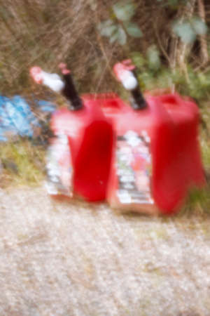 Three red fuel canisters stacked on a cobblestone street, with a vehicle and flags in the background