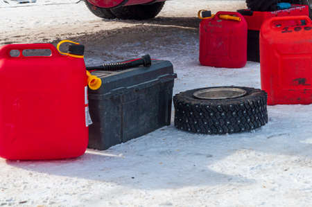 Spare wheel with tools and canisters. High quality photo Studded wheel lies on the snow next to the tool box and red fuel canisters
