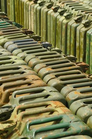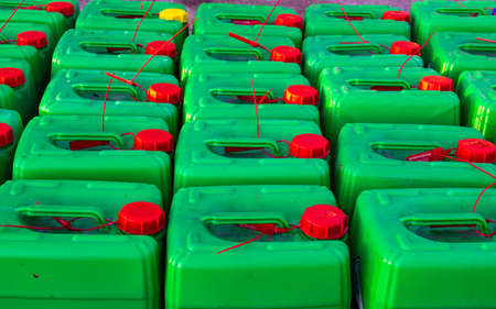 Many empty green plastic jerrycans background in warehouse, market, factory or exhibition