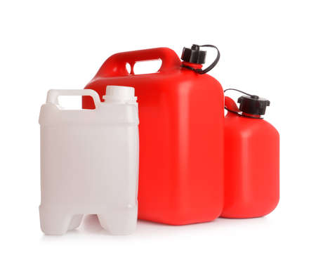 A single, vibrant red fuel canister is positioned on a grey asphalt road. The background features a blurred landscape of fields and trees under an overcast sky, isolated on white background.