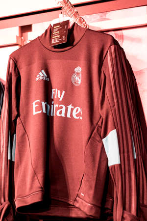 MADRID, SPAIN - 25 MARCH, 2018: Official clothing store and sports attributes for fans Real Madrid Football Club