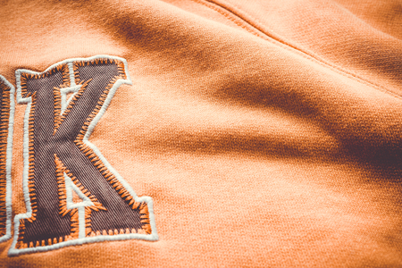 Close-up to fabric of a orange blouse with a few letters saw on it