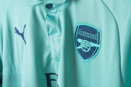Bangkok, Thailand - Jan 18, 2022 : close up Arsenal on Arsenal retro shirt third jersey season 2018-2019
