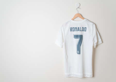 Bangkok, Thailand - Jan 18, 2022 : Real Madrid shirt home jersey season 2014-2015 with Ronaldo name hanging on wall
