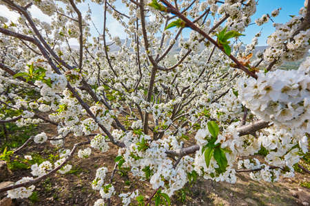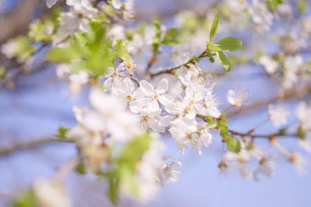 Fresh cherry tree branch with white flowers in a garden, against blue sky. Spring concept. Moody picture, soft selective focus, copy space