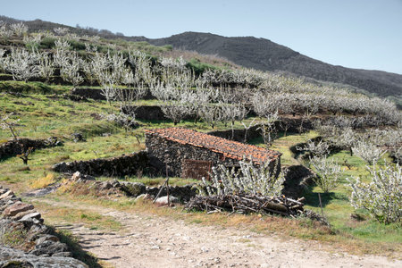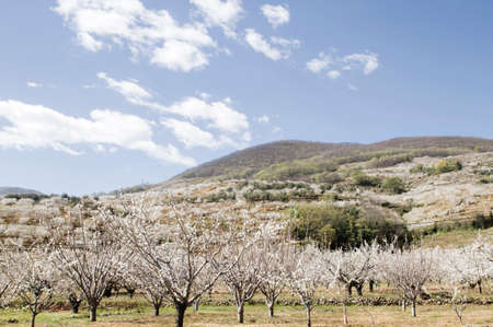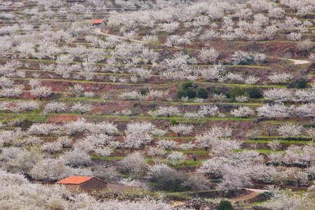 White hillsides motivated by the color of cherry blossoms in Valdastilla, Valle del Jerte