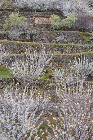 View of cherry blossom between mountains and terraces, Las Hurdes, Caceres, Spain