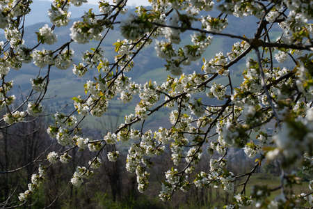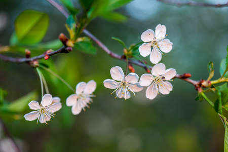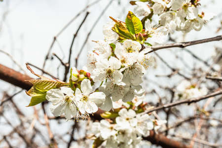 Cherry white flowers on a tree branch. Flowering season. Selective focus