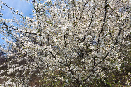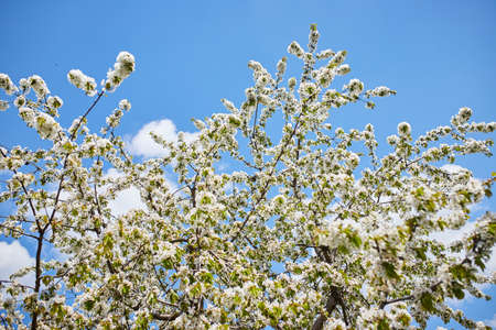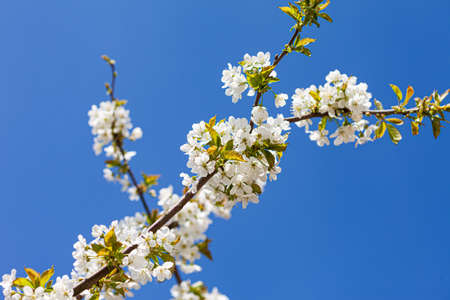 Branch of a tree with white flowers against the blue sky. Flowering or spring time.