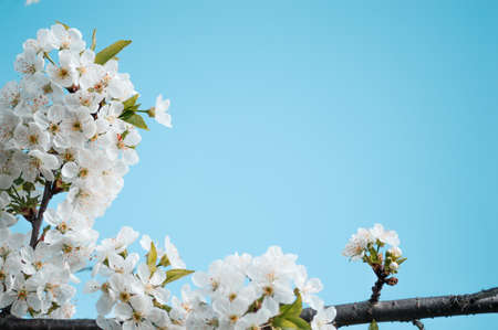 Nature background with white flowers blossoming in spring against bright blue sky
