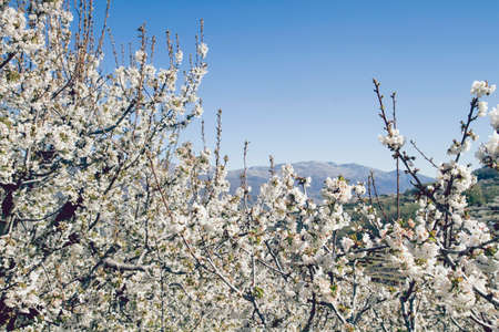Cherry blossom in Jerte Valley hills, Caceres. Spring Spain. Seasonal